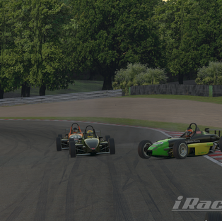 Lap 4. Bailes kept the lead by a thread, but Cleland would have a better run through Paddock - pulling alongside Bailes. They'd go side-by-side through Druids when Cleland would temporarily inch ahead on entry to Graham Hill Bend before Cleland would try a cut-back...down the Cooper Straight, Cleland would have the momentum and slipstream, and would slip down the inside of Bailes at Surtees.